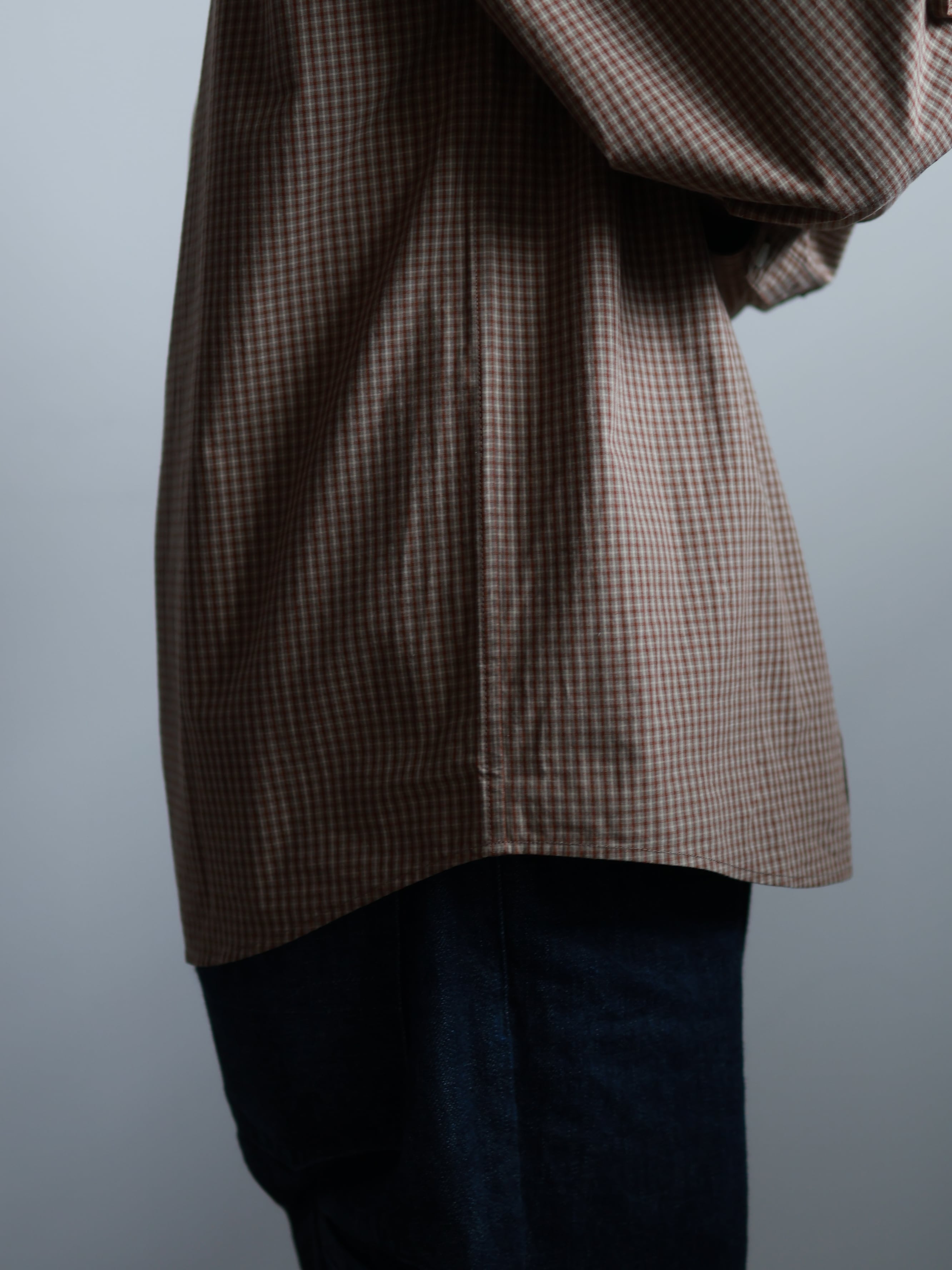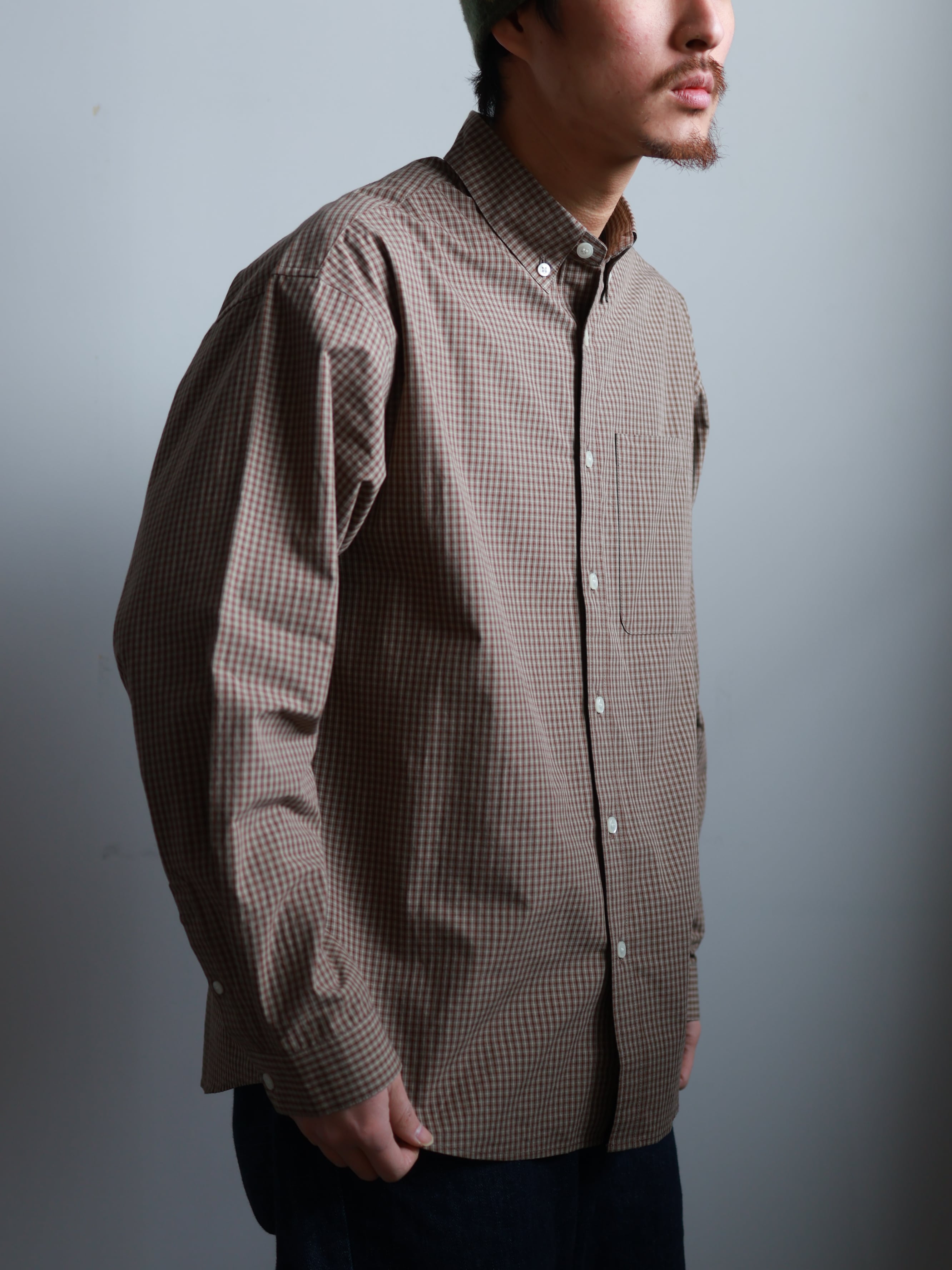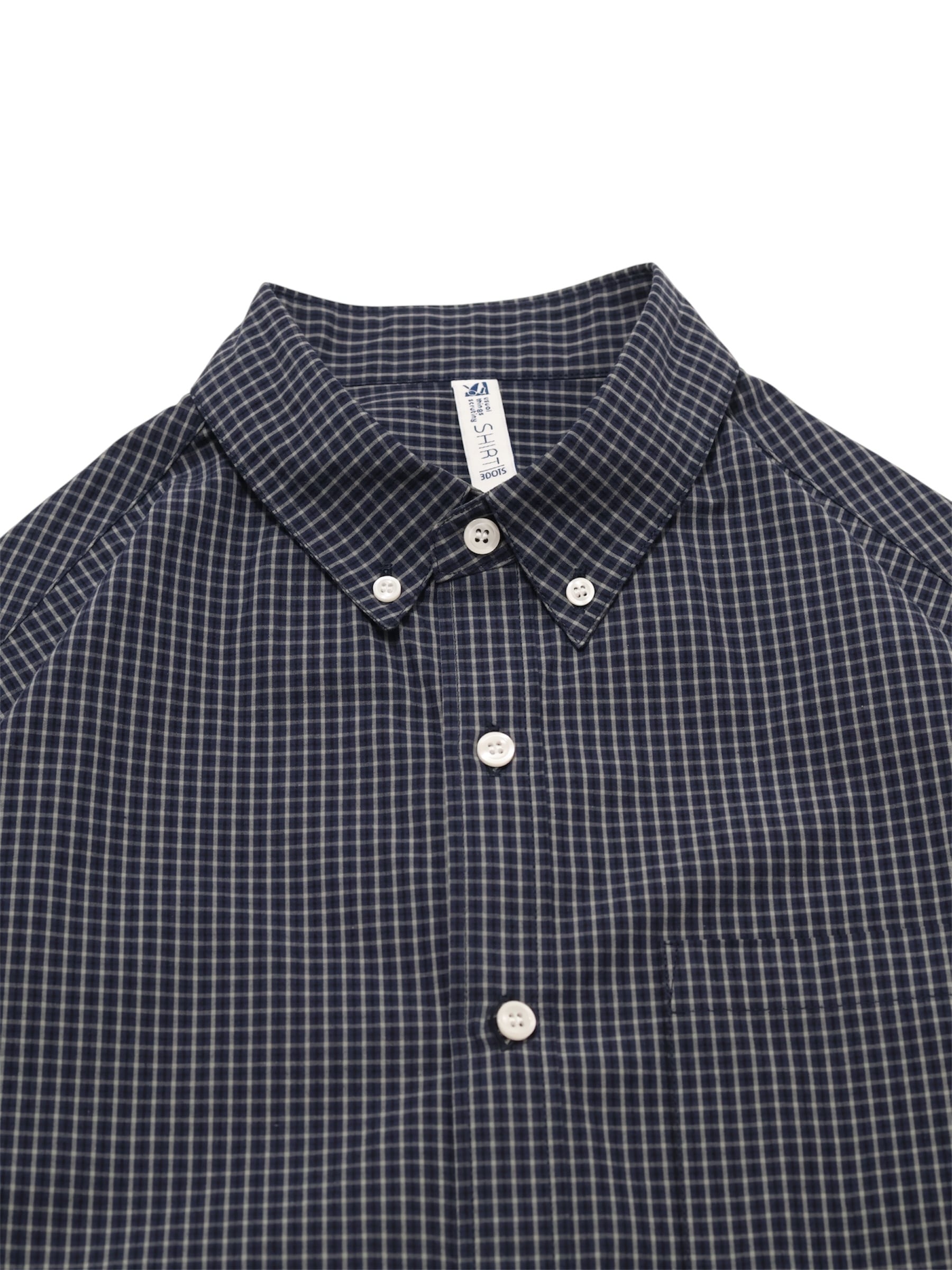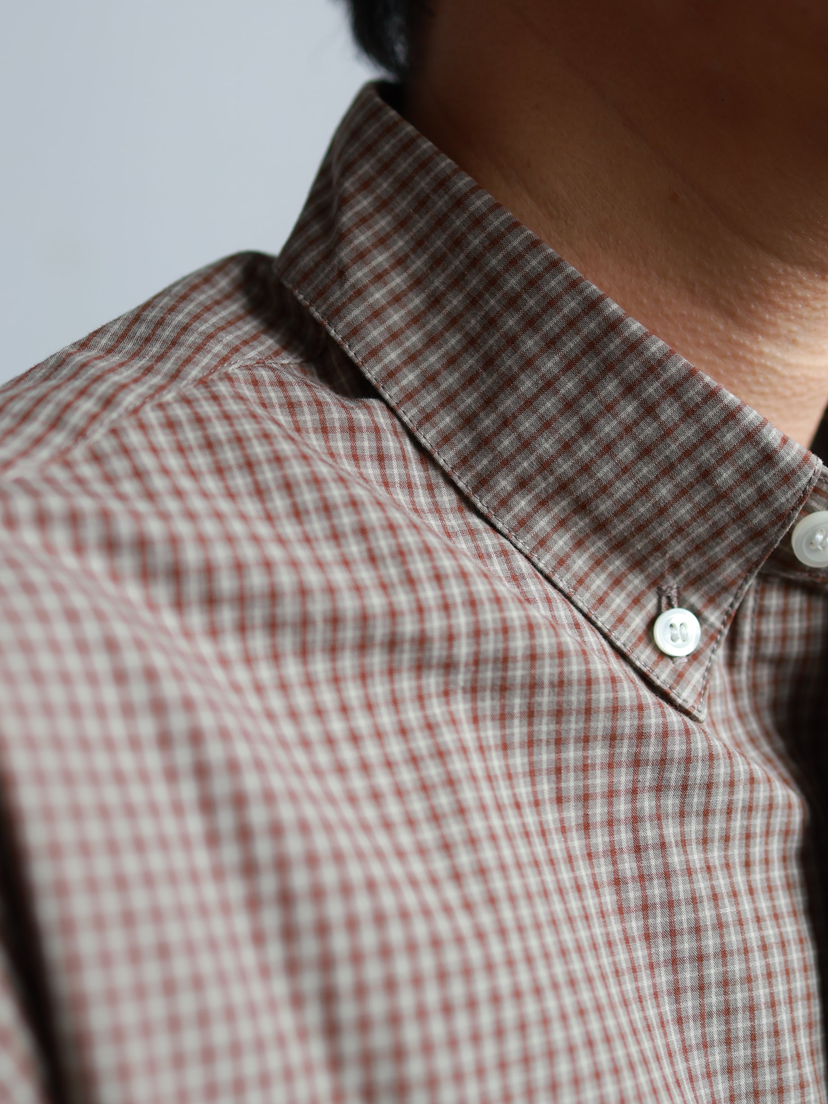 一般的なBDシャツよりもかなり低めに設定した台襟と衿、そして短い剣先によってBDシャツにしかない凛とした佇まいを保ちつつも程よくカジュアルダウン。