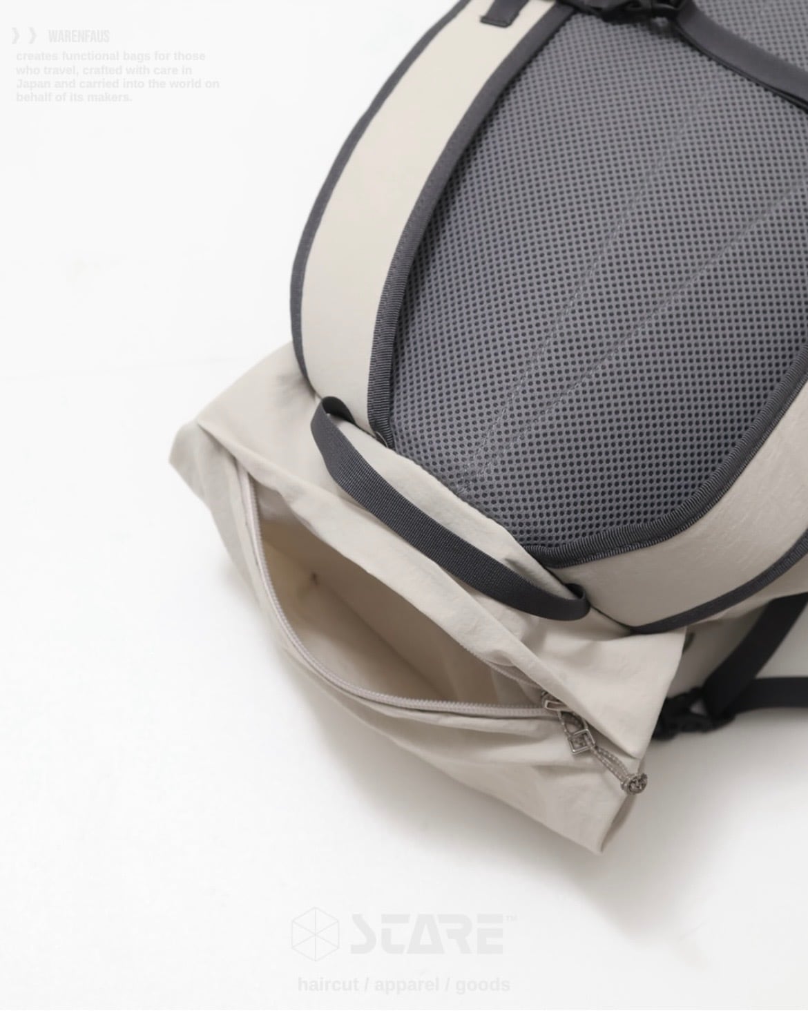 ULザックの主張的なロゴ、デザインをそぎ落とし、素材もいわゆるザックに多い光沢感があるテック生地ではなくマットなシワ感がある天然繊維見えする撥水性のあるナイロン素材を採用しております。
