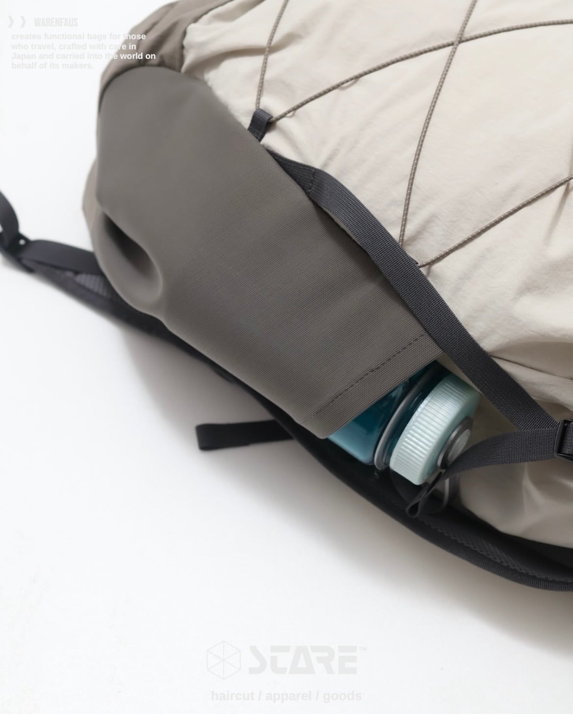 メイン収納はドローストリング仕様、サイドに両サイドメッシュポケットがあり、ボトルやクイックにアクセスする小物を収納可能です。