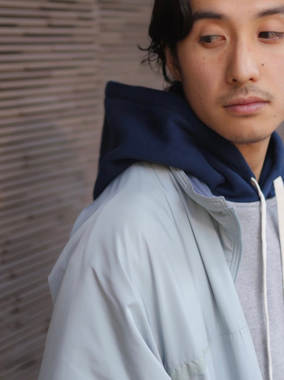 1st Deliveryで登場した <HEAVY KANOKO V-NECK P/O>と同じオリジナル鹿の子裏毛を使用したフーディー。フード部分のみ軽やかな別素材で切り替え、リラックスした着心地を実