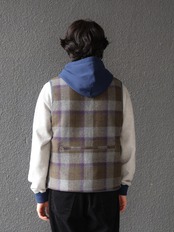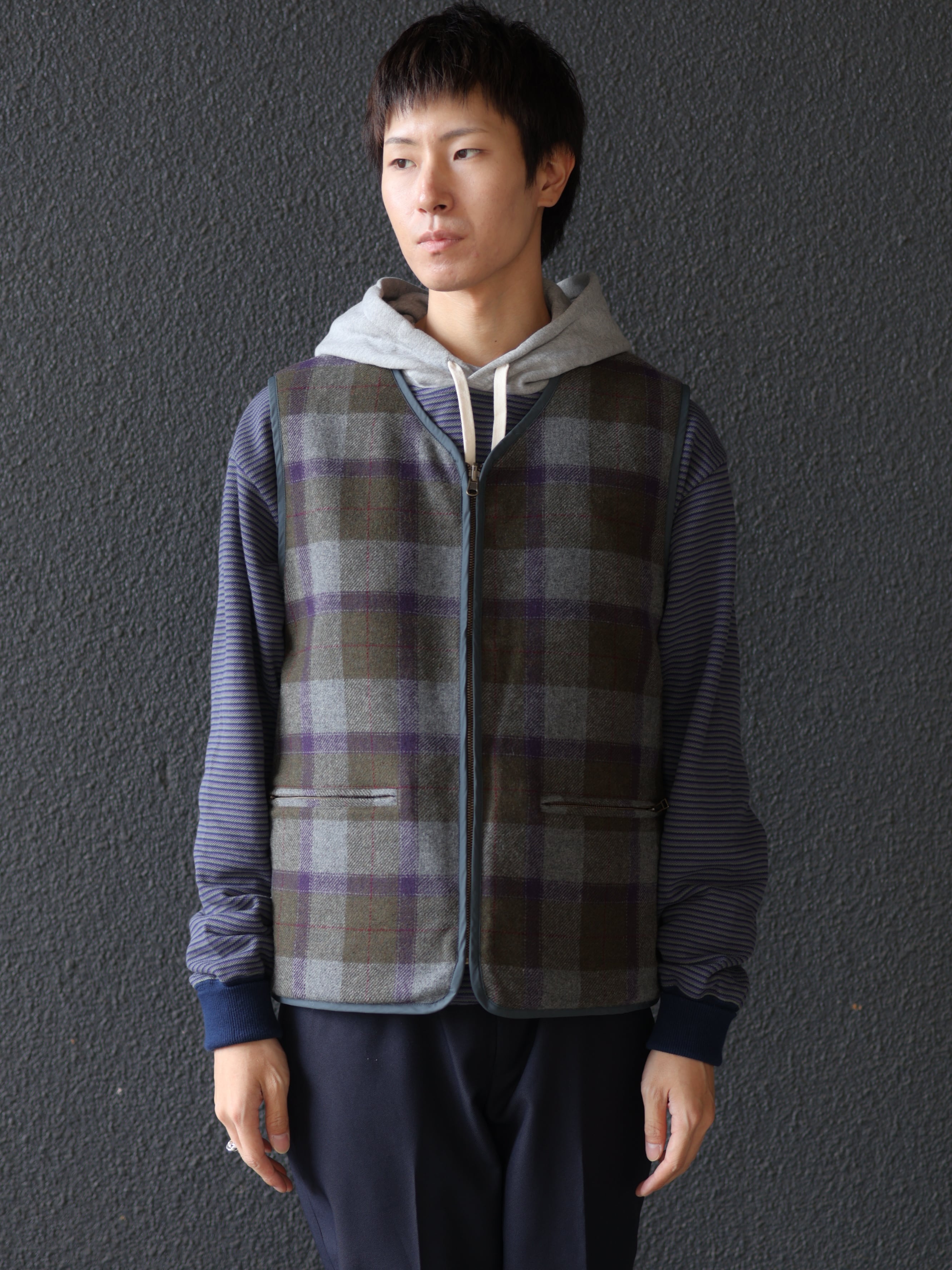 片面は温かみのあるウールのチェック柄、もう片面は撥水性のあるナイロン生地と表情の違う二面性を持つリバーシブルベスト。