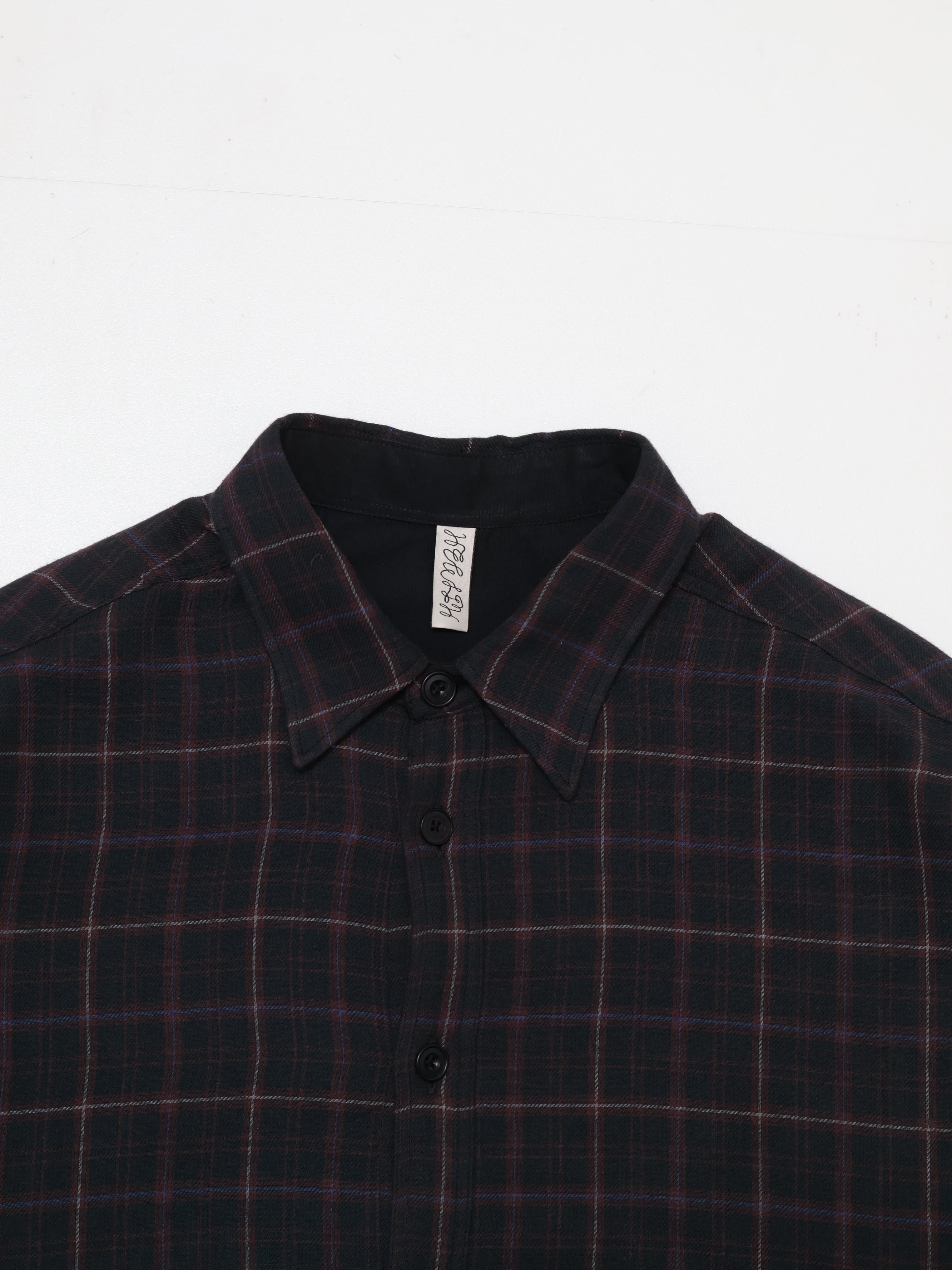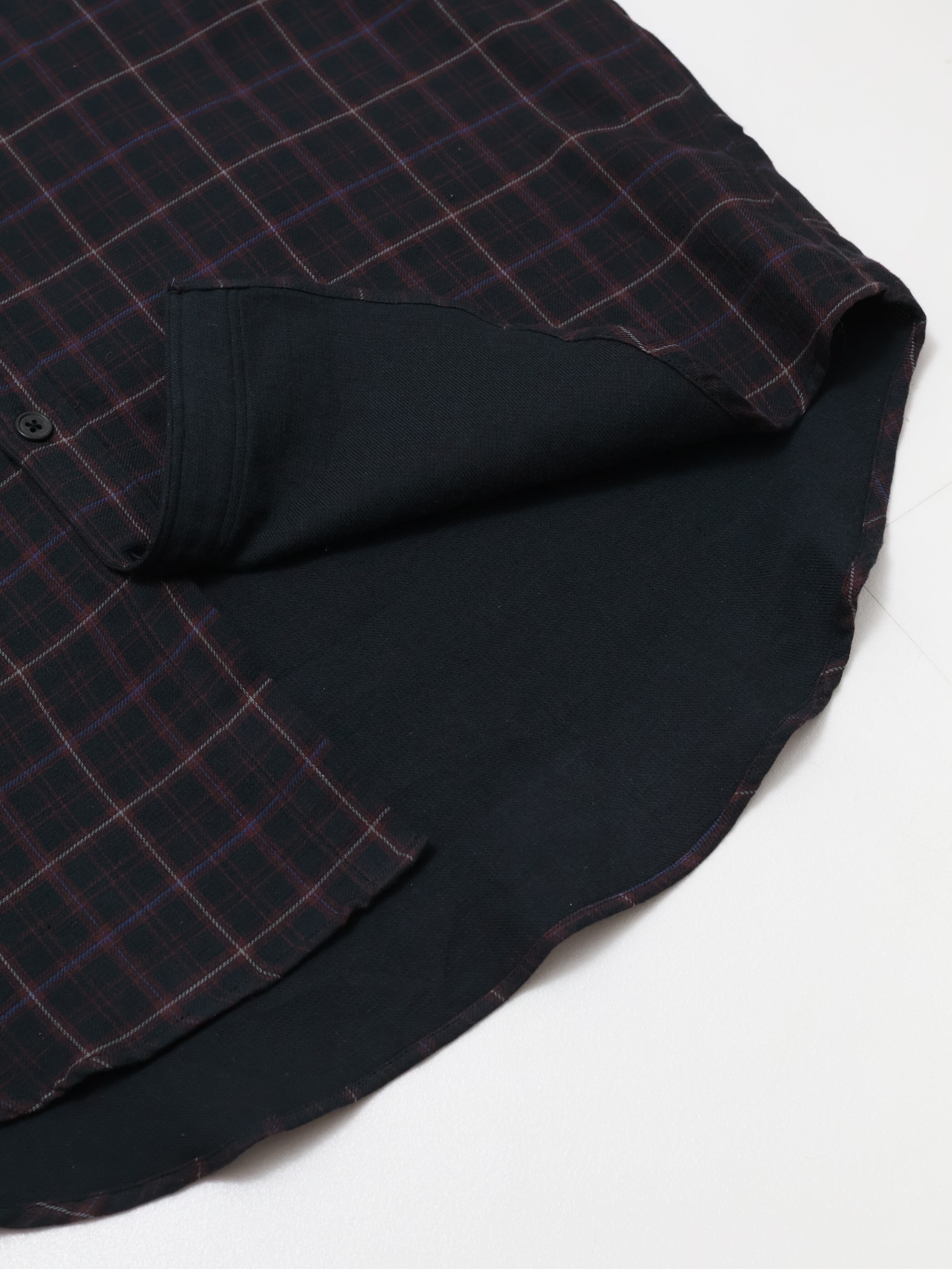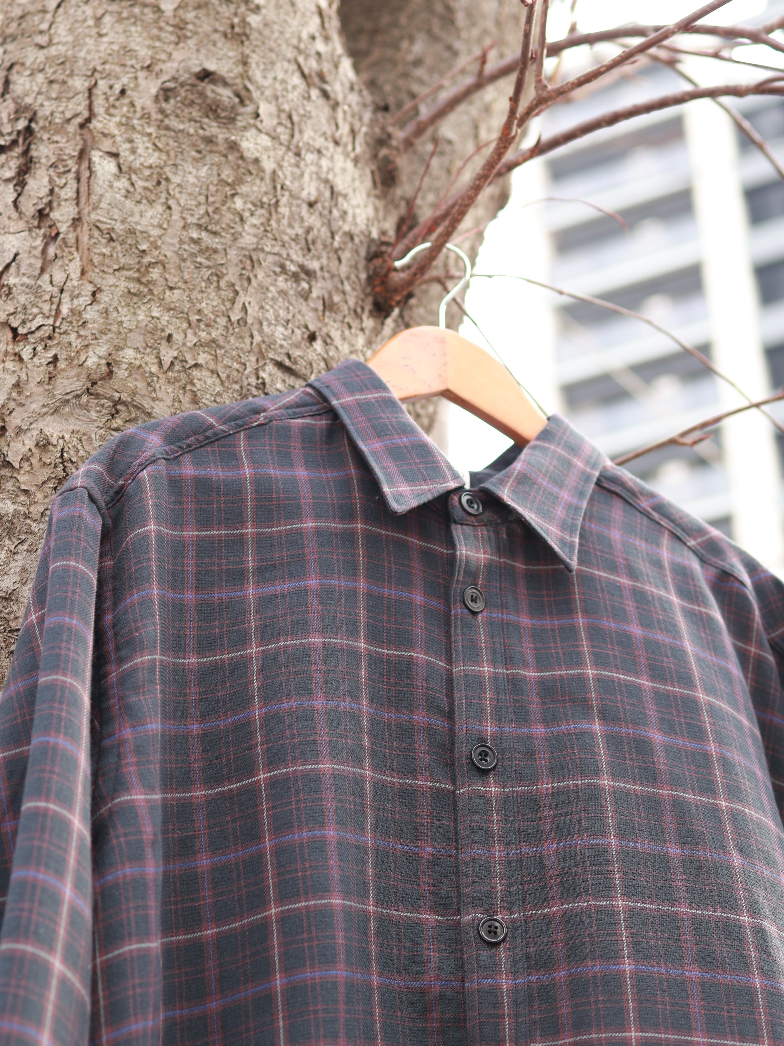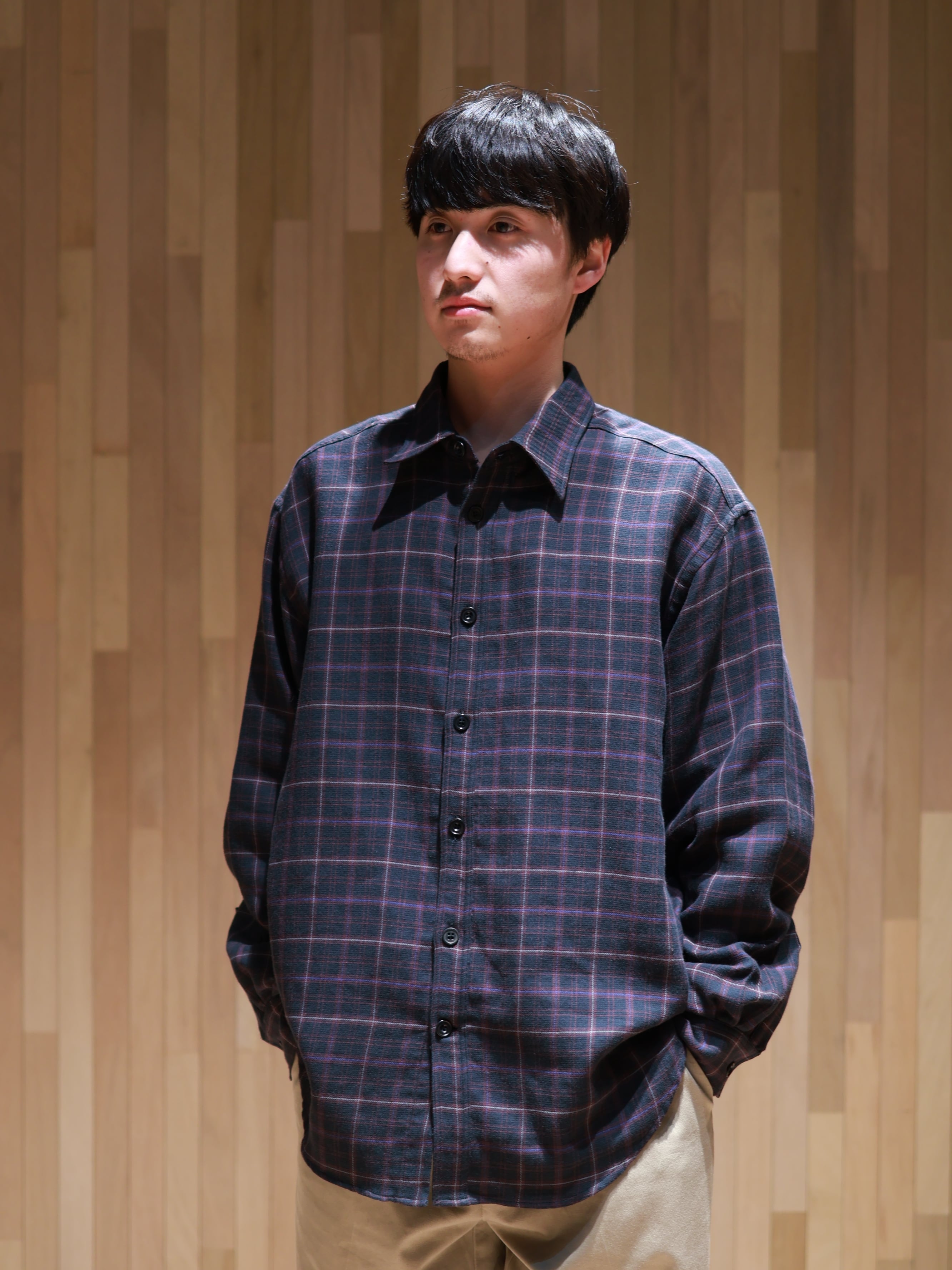 長袖の定番レギュラーシャツ。ゆったりとした着やすいワイルドシルエットはそのままに、今回は胸ポケット無しの仕様です。播州(西脇)で賃織り(家内工業)を営む機屋のデッドストックです。山奥の倉庫にて発見されました。播州織は50年代後半より90年代以前までは60%を輸入用に織られていたこともあり海外向けの配色やデザインは大変興味深いものがあります。80〜90年代のMADE IN USAの古着のシャツによくみられる播州織。C100の安心感のある乾いたタッチが最高です。