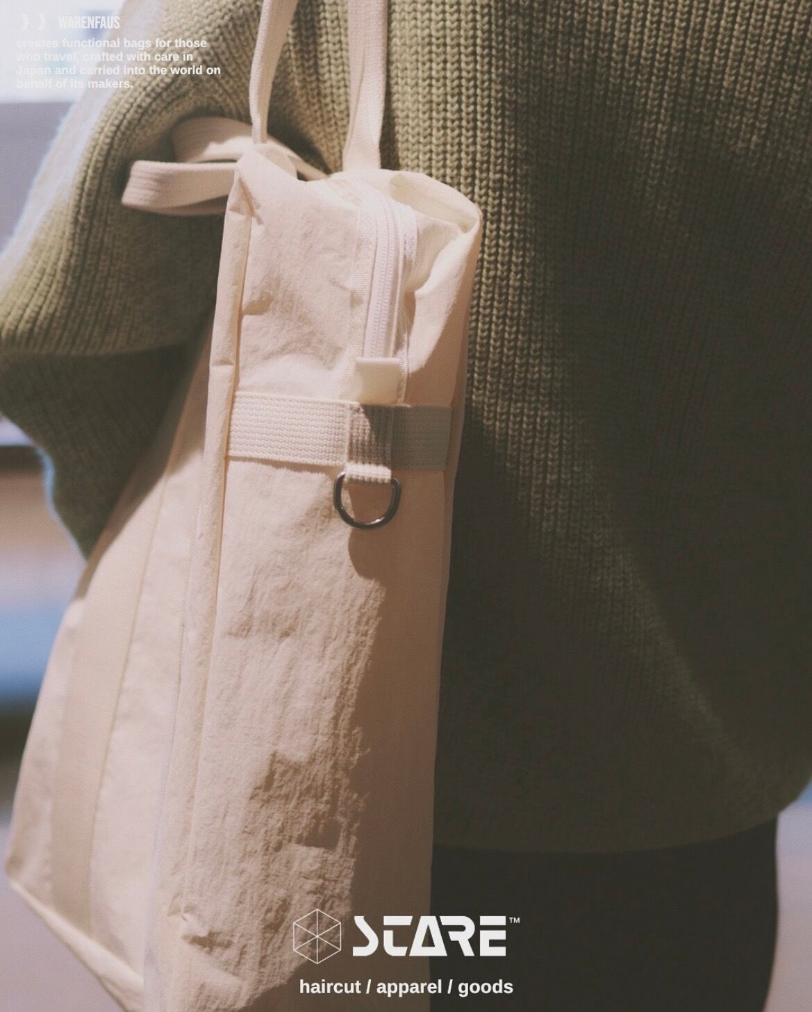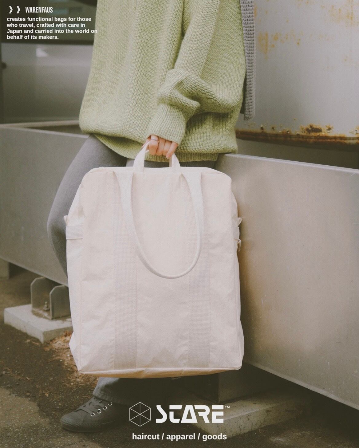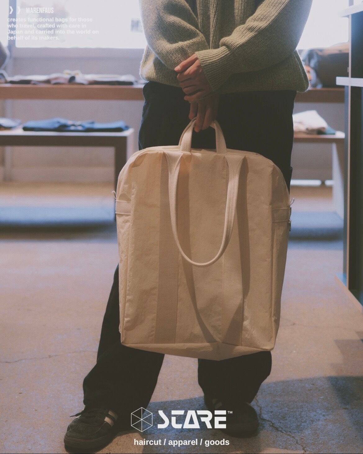米軍パイロットが使用していた“Flyers Kit Bag“から着想を得たトートバッグ。高密度ナイロンにKONBU加工を施し、まるで天然素材のようなよ表情に仕上げています。