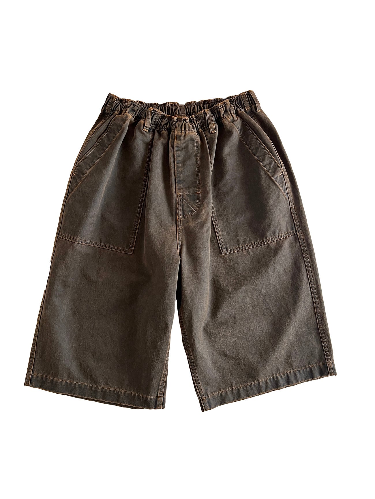 植物性ワックスによる独特なエイジング感が特徴の生地を使用したベイカーショーツ。25SSのDenim Buggy Shortsから股上を浅くしたスッキリとしたシルエット。ウエストはゴム仕様でながらベルトループも付くので、タックインでの着こなしにも対応。